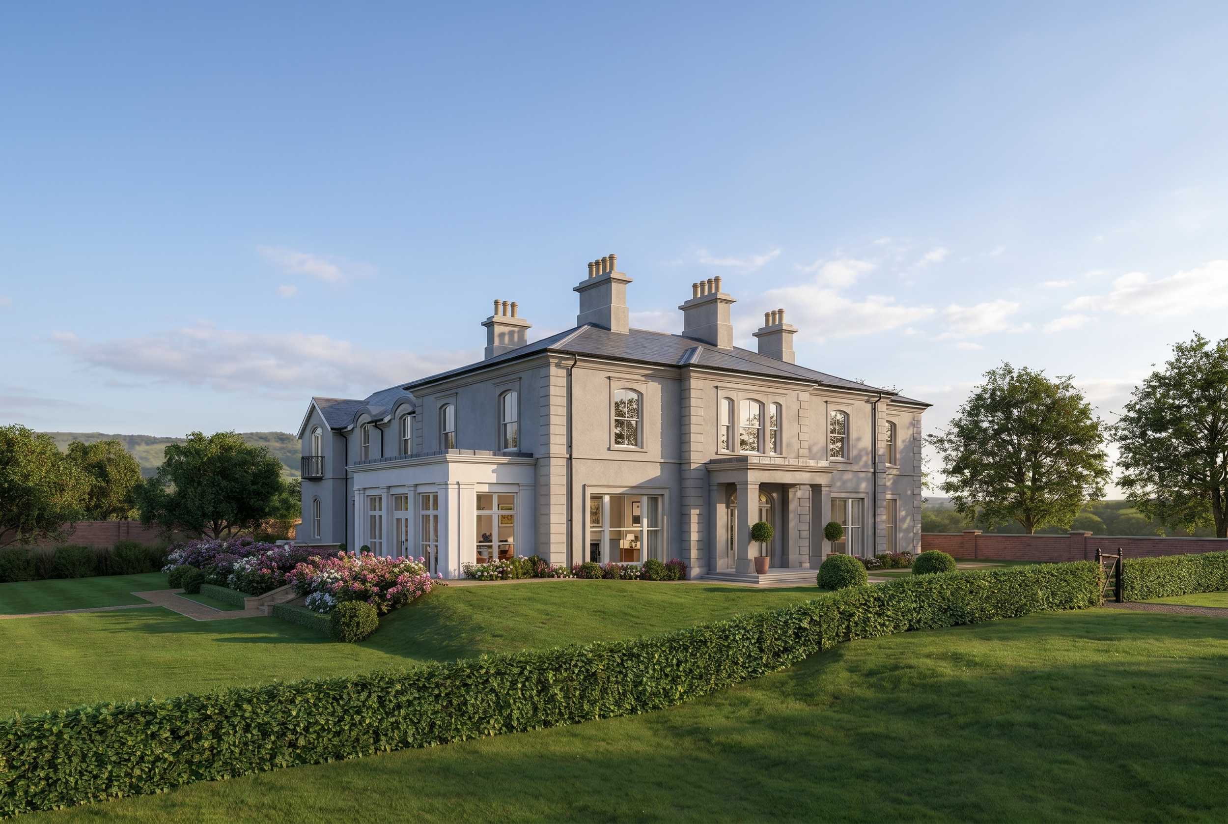 Criteria: This house on an elevated site had a pleasing aspect overlooking a mature garden and river. It was important to place the living spaces of the house facing the Garden. The South-West facing garden allowed the evening sunshine to be brought into the heart of the house. The style of a relaxed Georgian Country House sits comfortably in the landscape.
